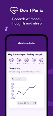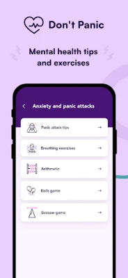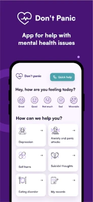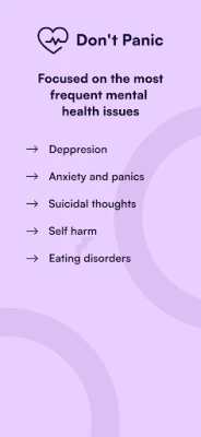 The app helps manage depression, anxiety and panic, self-harm, suicidal thoughts, and eating disorders. It contains practical techniques, advice, interactive breathing exercises, distraction games, and contacts for professional help.