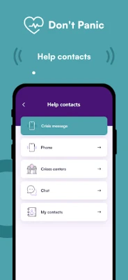Contacts for help – direct calls to crisis hotlines and centers, option for chat support and online therapy, personal SOS contacts.