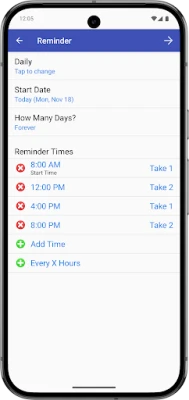 Pill Reminder - Never forget to take your medications again with this app. It's easy to use and reliable, allowing you to set up any recurring reminders you need (every X hours, specific times, daily, weekly, specific days of the week, every X days, etc).